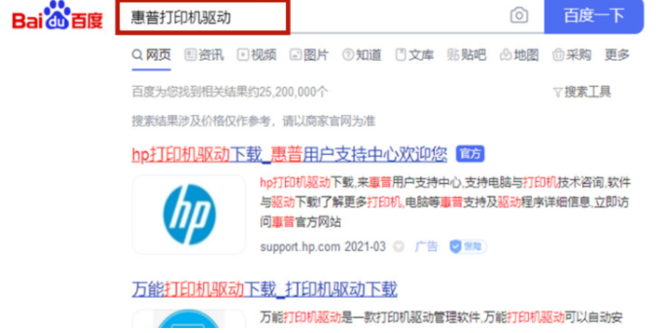 1.直接在百度中搜索“惠普打印机驱动”,点击后面有“官方”标识的网站就可以惠普驱动的更新网站。