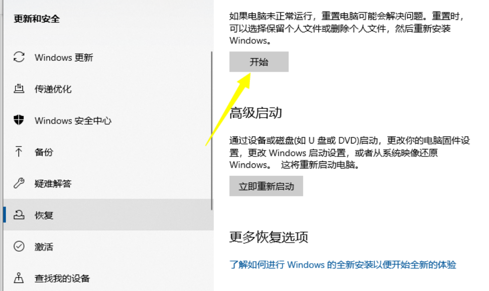 2、出现的设置界面,我们点击左侧的恢复选项,然后选择右侧的重置此电脑。