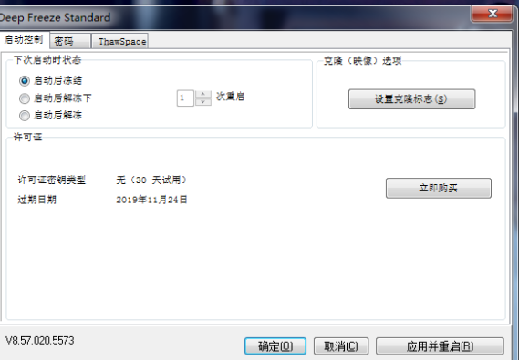 若选择第一个选项“启动后冻结”,那在系统重启后即恢复为原始状态;若选择第二个选项“启动后解冻下_重启”,那就会在第几次重启以后恢复为原始状态若选择第三个选项,关闭了冰点还原,对电脑不会产生任何影响。