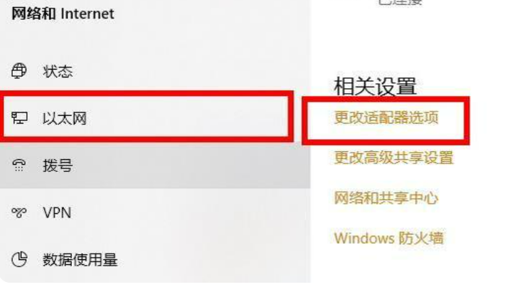 2、随后点击左侧任务栏中的“以太网”,并点击“更改适配器选项”。