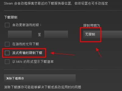 4.点击下载后,在右边选择限制宽带为:无限制。把流式传输限制下载取消打勾状态。steam下载速度可以拉满了。