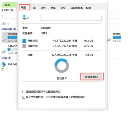 2、选择“常规”选项卡,点击【磁盘清理】。