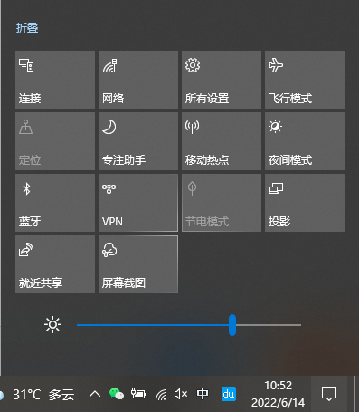 2、点击电脑通知栏图标,展开拖动滑块调节亮度。