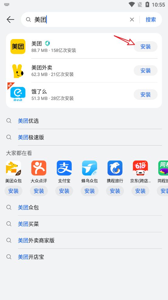 2.进入商店后,搜索美团,并点击【安装】。接着等待安装即可。