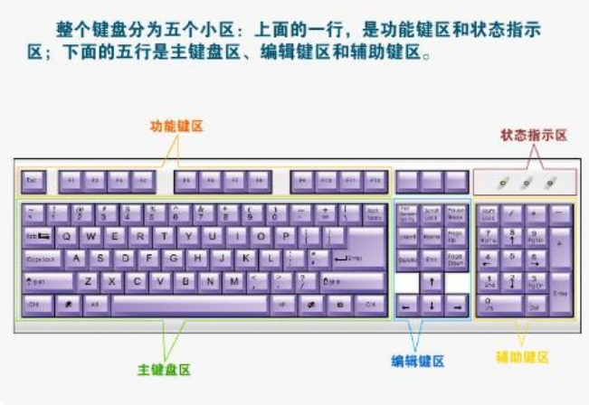 1、可以看出键盘分成五个区域,为功能键区、状态指示区、主键盘区、编辑键区、辅助键区