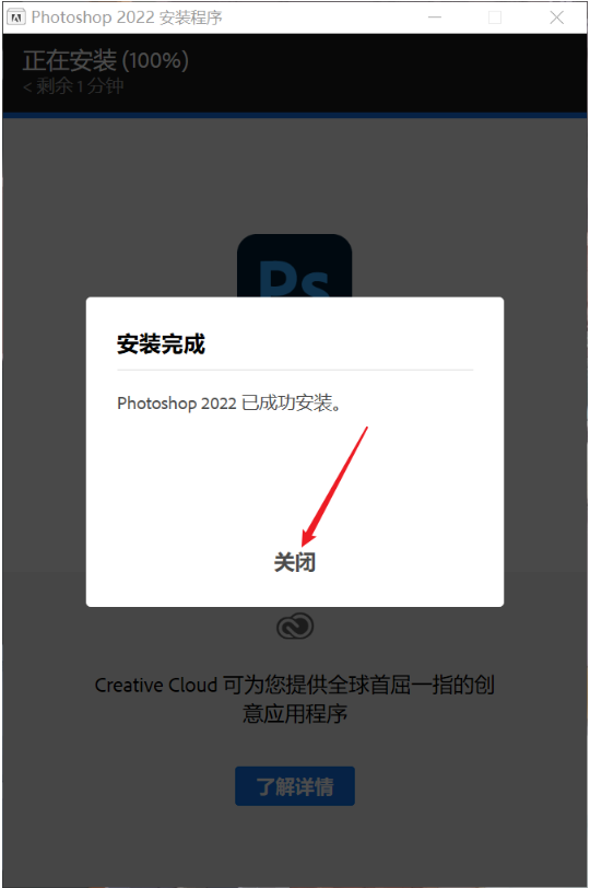7、这时可以看到电脑桌面自动生成一个快捷图标。我们也可以点击桌面左下角按钮,找到【Adobe Photoshop CC2022】直接拖拽到桌面即可生成快捷图标。