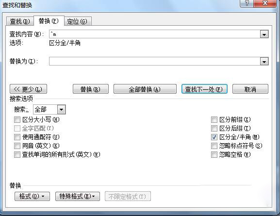 4、假如是插入分页符造成的空白页,少的话,删除分页符就行,就是到空白页顶部按退格键。如果分页符很多,可以依次单击开始-编辑-替换-更多-特殊格式-手动分页符,接着点击全部替换即可。
