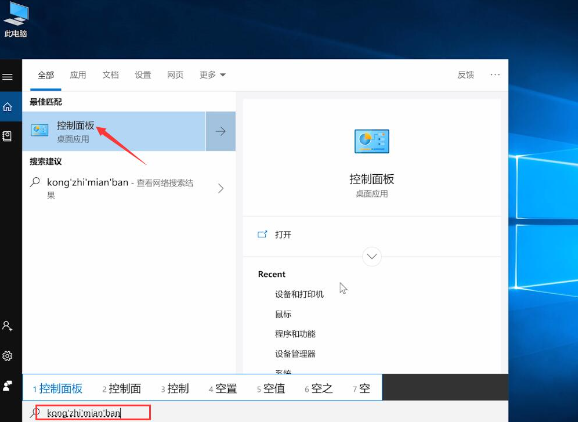 2、按下键盘win+s组合键,在搜索栏输入控制面板并点击进入。
