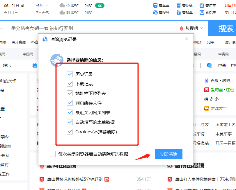 3、然后在弹出页面,勾选所有选项,点击“立即清除”,等待一段时间即可彻底清除缓存。