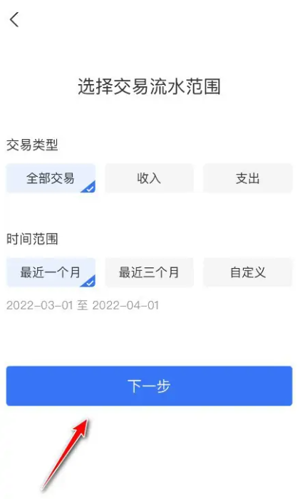 6、选择交易流水范围,点击下一步并填写邮箱发送,在邮箱即可收到文件。