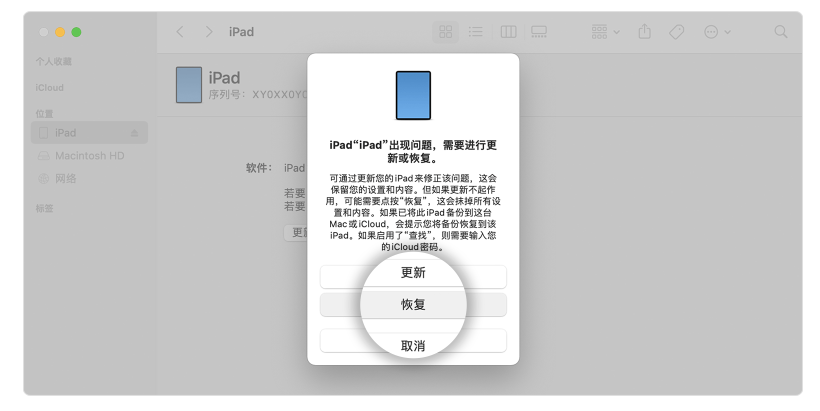 5、在所连电脑上的“访达”或 iTunes 中,找到您的 iPad。选择“恢复”。电脑会下载适用于您的 iPad 的软件,并开始恢复过程。如果下载时间超过 15 分钟,并且设备退出恢复模式屏幕,请等待下载完成,然后将 iPad 关机并重新开始。最后将 iPad 与电脑断开连接,然后设置即可正常使用 iPad了。