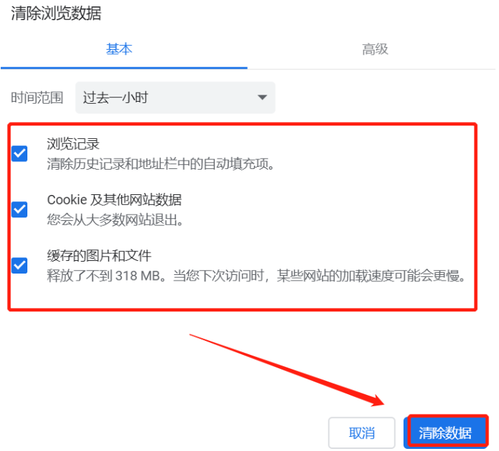 2.点选需要清除的浏览数据,点击【清除数据】这样就能清理浏览器缓存了。
