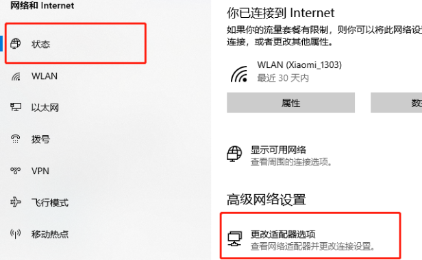 2、在状态下点击更改适配器;