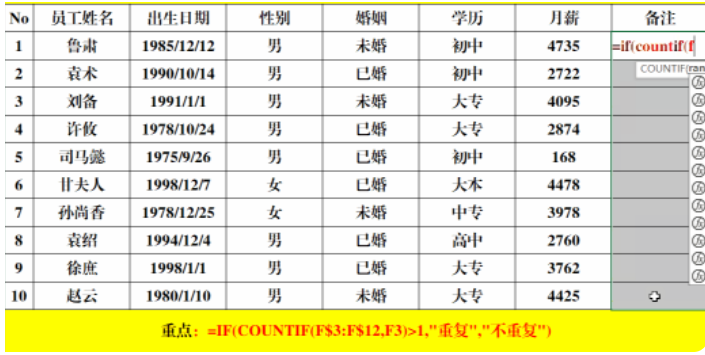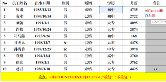 判断是否重复:=IF(COUNTIF(F$3:F$12,F3)>1,"重复","不重复")