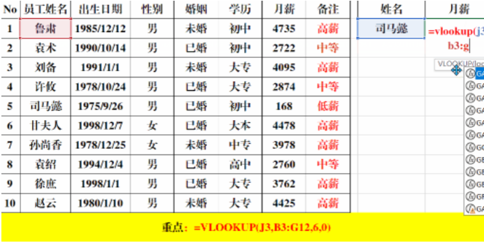 查找信息:=VLOOKUP(J3,B3:G12,6,0)