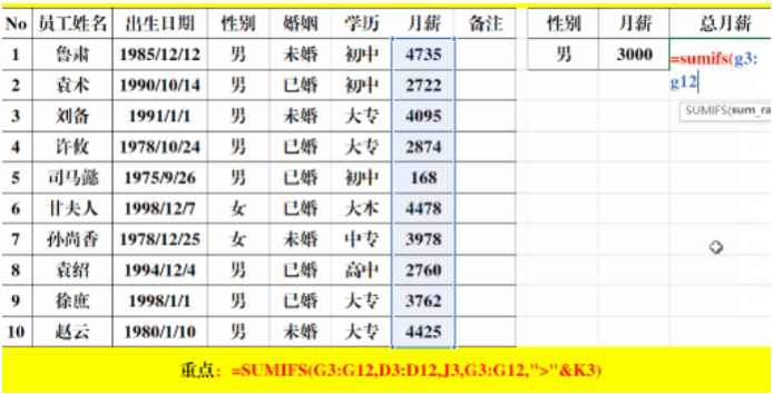 多条件求和:=SUMIFS(G3:G12,D3:D12,J3,G3:G12,">"&K3)