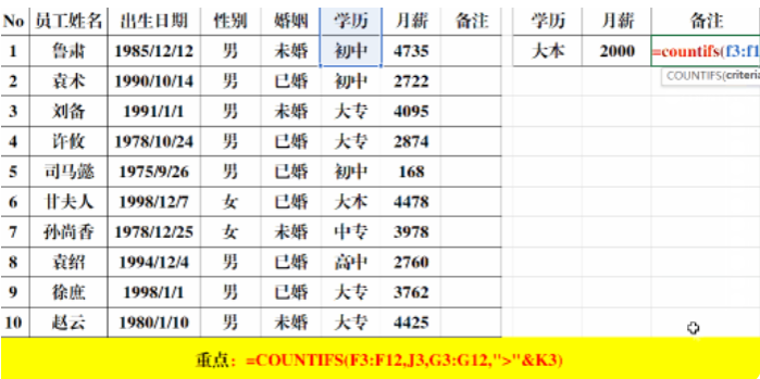多条件计算:=COUNTIFS(F3:F12,J3,G3:G12,">"&K3)
