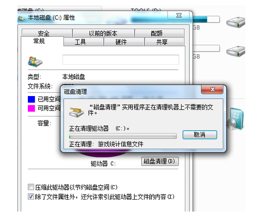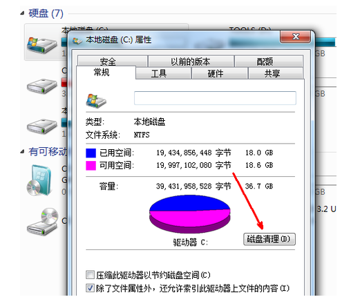 1、进入c盘的属性界面,开始清理磁盘。