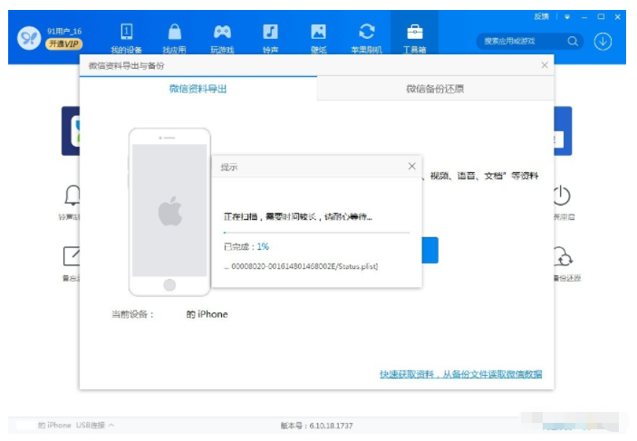 使用方法:工具箱——微信备份还原——微信资料导出,需要注意的是使用91助手备份需要在手机上打开登陆微信,并保持手机解锁.