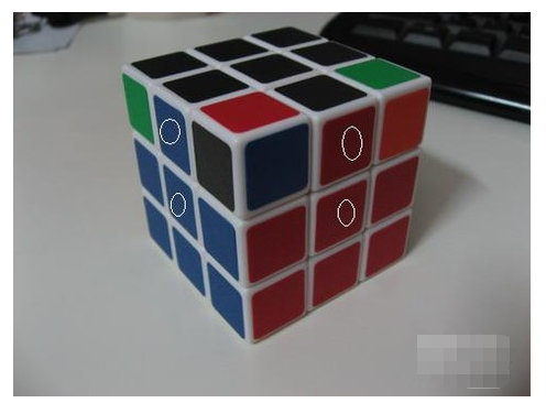 6、四侧面上层两角的方块归位,并不是指颜色要对上,只要这块的颜色和所在的三个面的颜色相对应即可。