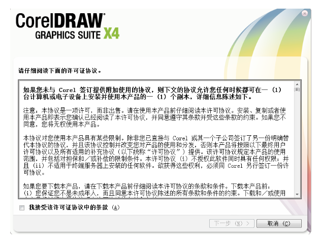 3.加载完成后进入到CorelDraw X4的安装协议界面,勾选同意协议后,点击【下一步】继续安装。