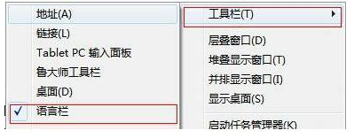 2、如果不行的话我们就在任务栏 空白处单击右键,然后选择工具栏的语言栏调出语言栏。