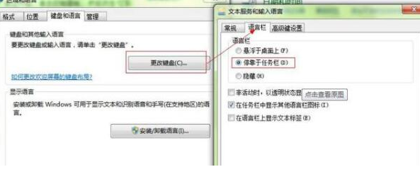 3、如果第二种方法还不行,那么我们就打开控制面板,选择时针然后点击语言和区域,再点击区域语言然后选择更改键盘和其它输入法。之后在语言栏中选择停靠于任务栏即可。