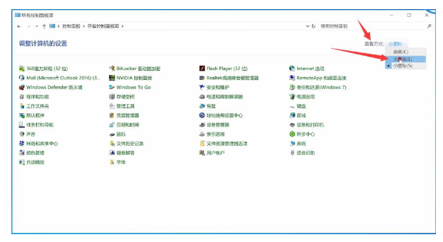 2、打开控制面板,点击右上角的查看方式,选择大图标。