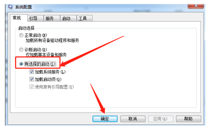 5.在系统配置的窗口中选中“有选择的启动”,并勾选下方全部子选项,然后点击确定。