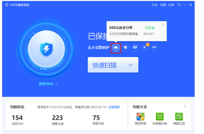 1、打开360杀毒极速版软件,点击防护中心进入新的界面。