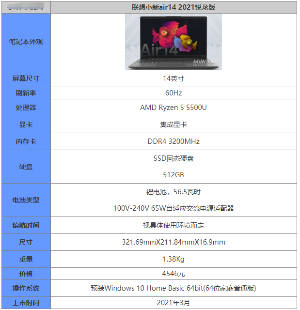 一、联想小新air14锐龙版核心参数配置