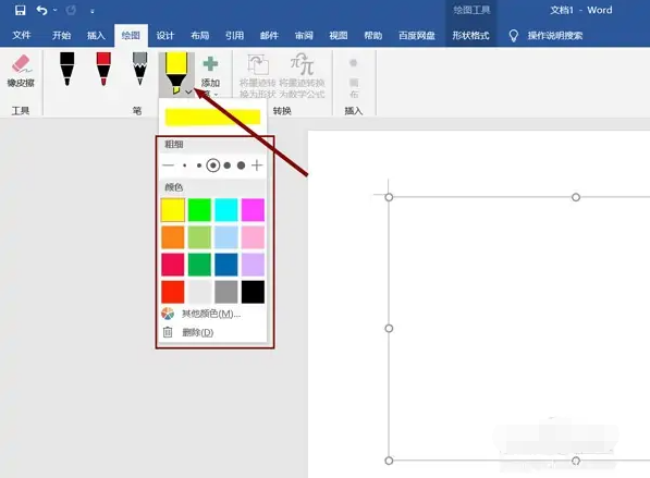 3、然后在功能栏点击需要的笔的右下方倒三角图标,这样就可以选择画笔的颜色和粗细了。