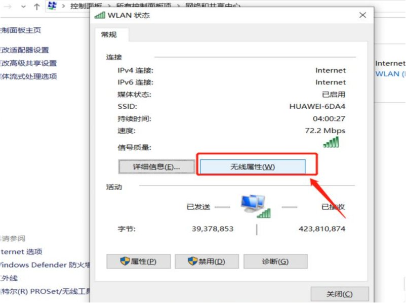 1、依次打开电脑的:控制面板 → 网络和 Internet → 网络和共享中心,然后在网络和共享中心选择已经连接的wifi连接,在弹出的WLAN状态中选择无线属性。