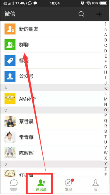 1、首先打开微信,点击“通讯录”,然后点击上方的“群聊”进入。