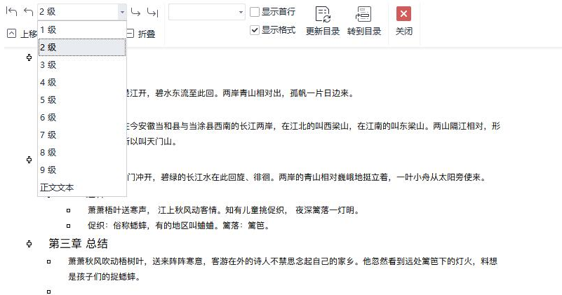 3、调整文档内容各标题对应的等级,如一级标题、二级标题、正文文本等。