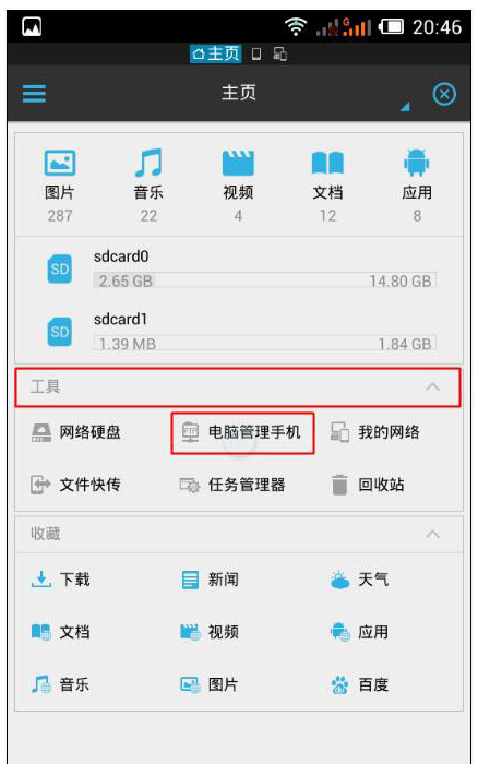 1、首先打开ES文件浏览器,进入主界面中,点击 “工具”下方的“电脑管理手机”功能。