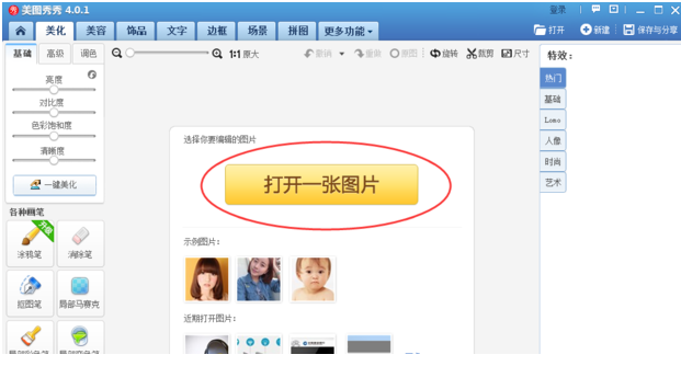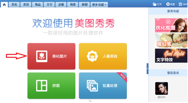 1、首先打开电脑上的美图秀秀,点击里面的“美化图片”进入。