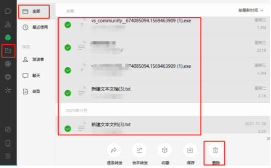 方法二:微信文件单独清理,在电脑微信主页面,选择左侧的微信文件图标,就能打开微信文件界面。按时间线查看所有缓存的微信文件,右键多选需要删除的文件,再点击“删除”键就可以了。