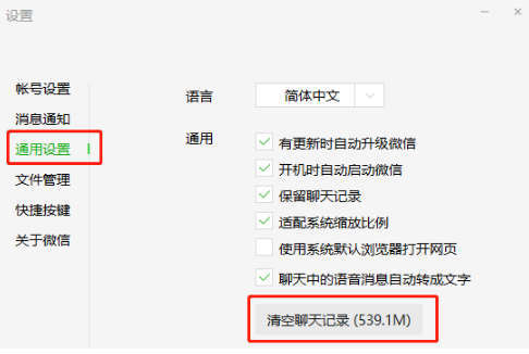 方法一:微信聊天消息清理,同样是在设置界面,选择通用设置选项,页面刷新后,点击“清空聊天记录”就能清理电脑微信文件缓存。不过这种方法会将微信聊天记录全都删掉。