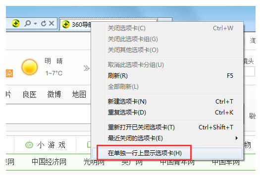 7、若想要单独一行显示选项卡,可以在下拉列表中点击“在单独一行上显示选项卡”。