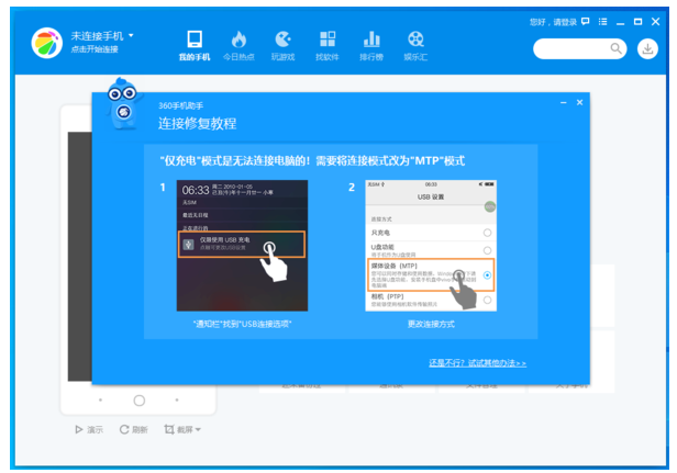 3、接着软件会弹出连接修复的教程,如果你的手机是仅限使用USB充电的话,是无法连接到电脑的,我们需要将连接的模式改为【MTP】模式才行。