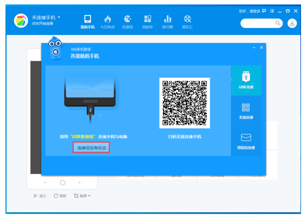 2、如果这时手机已经通过数据线与电脑进行连接了,但是360手机助手并没有连接成功的提示,那么这时点击【连接但没有反应】按钮。