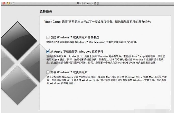步骤四:电脑插入Windows 安装U盘或者光盘之后,再次启动Boot Camp助理,然后选择安装Windows 7 版本。
