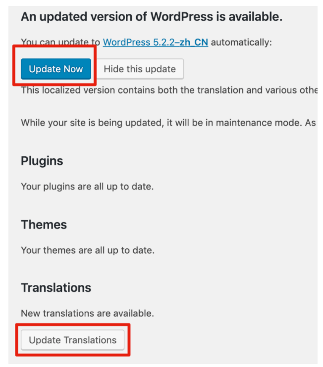 3、选择Update Now更新版本或者Update Translations更新翻译都可以实现从英文版切换为中文版的功能。