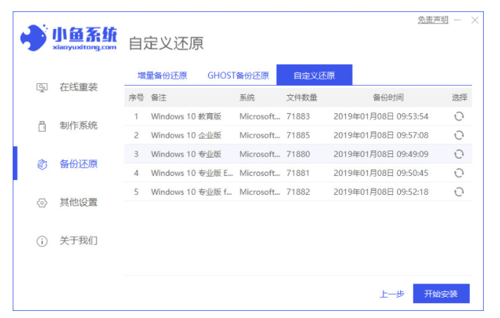 2、打开小鱼一键重装系统工具,点击备份还原,找到已下载的win10镜像。