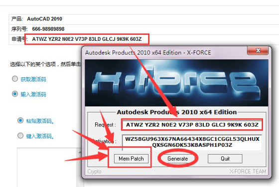 6、打开注册机,复制申请号到注册机的第一个空格,然后点击中间的“generate”翻译按钮,第二个空格会自动填满,再点第一个“men patch”匹配按钮,这个一定要按;