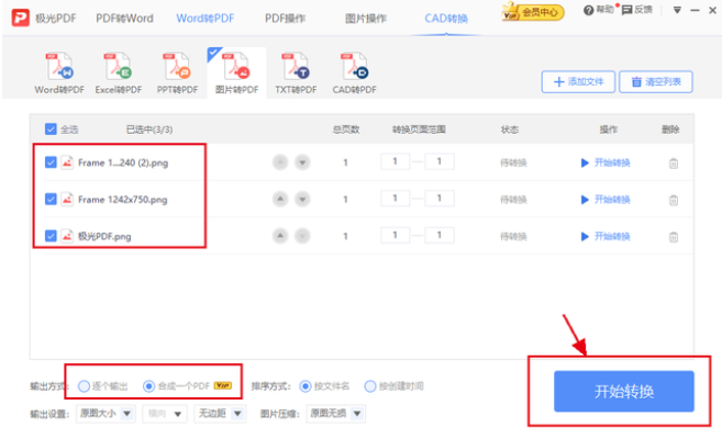 2、将要转换的图片批量添加到到转换器中间的转换区域,点击【开始转换】就可以了,它还有个亮点就是支持按文件名排序或者按创建时间排序。