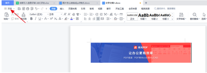 1、打开Word文档软件,插入需要转成PDF的图片,自行调整好图片的位置和格式,然后点击工具左上角“文件”,选择“另存为”。