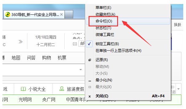 4、同样的,在下拉列表中选择“命令栏”,ie浏览器则出现一系列的工具按钮。