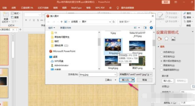 4、在电脑中找一张自己喜欢的背景图片,点击“插入”。